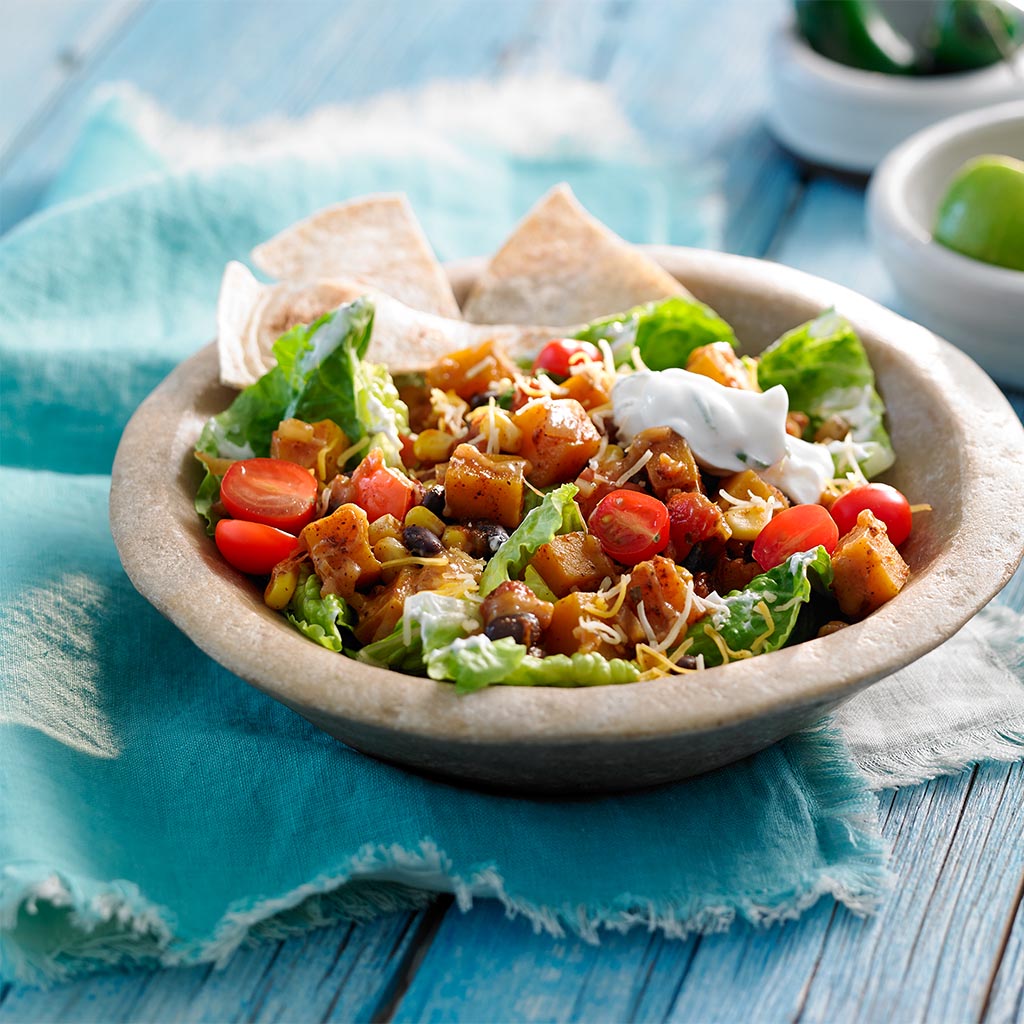 Sweet squash and black beans simmered with chili, oregano and tomatoes on top of crispy greens make for a satisfying and tasty main course salad with the bonus of plenty of fibre. The zesty lime yogurt dressing and cheese complement this dish perfectly. For added crunch, make some baked tortilla chips to add on top of the salad or as a side.