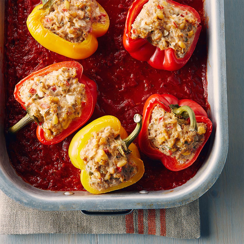 Bake for 45 minutes and until the stuffed peppers are thoroughly cooked and a thermometer registers internal temperature of 160°F (71°C). Serve peppers with the pan sauce.