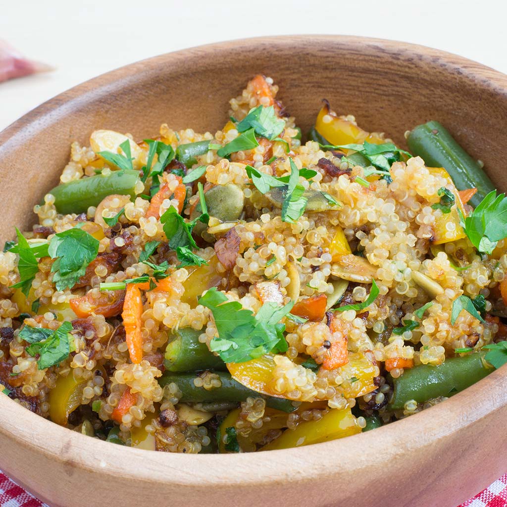 Look for quinoa in the organic, healthy or bulk section of the grocery store. You can also find it in health food stores.