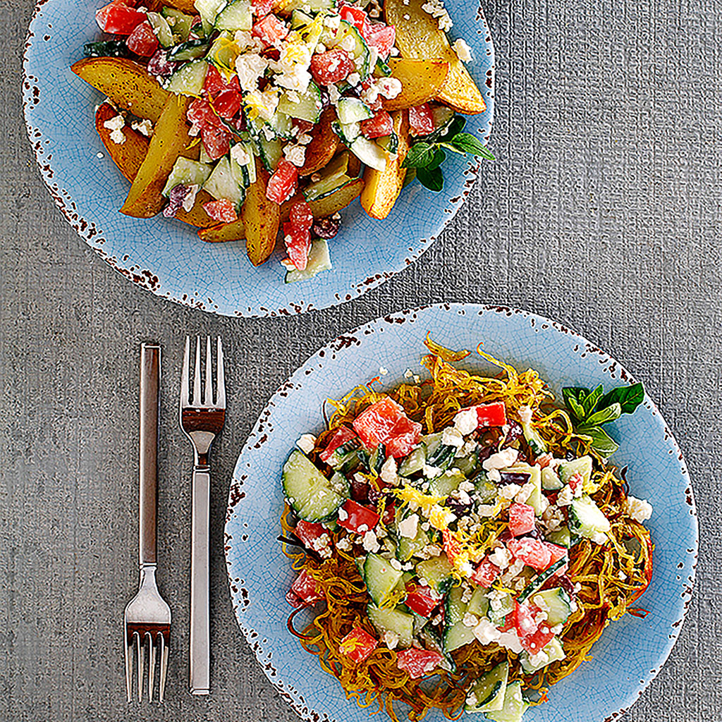 Transfer potatoes onto a serving platter. Top with cucumbers, tomato, feta and olive mixture and drizzle with yogurt sauce. Serve immediately.