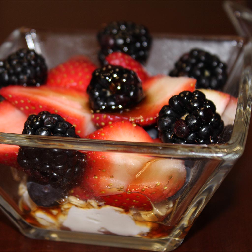 Top with strawberries, blackberries and blueberries. Drizzle with maple syrup, if using.