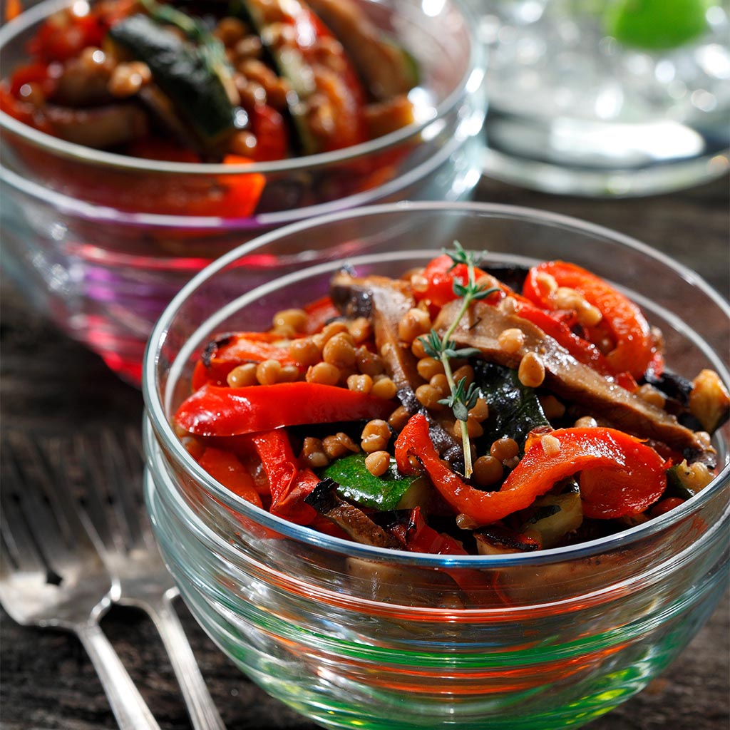 Slice the peppers, mushrooms, and zucchini into strips. Toss the lentils and vegetables with desired amount of reserved dressing. Serve warm or cooled.