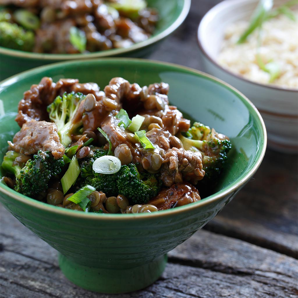 Toss broccoli and cooked lentils back into the pan with the sauce and cook for another couple of minutes to heat the lentils through while stirring. Add beef to bring all together.