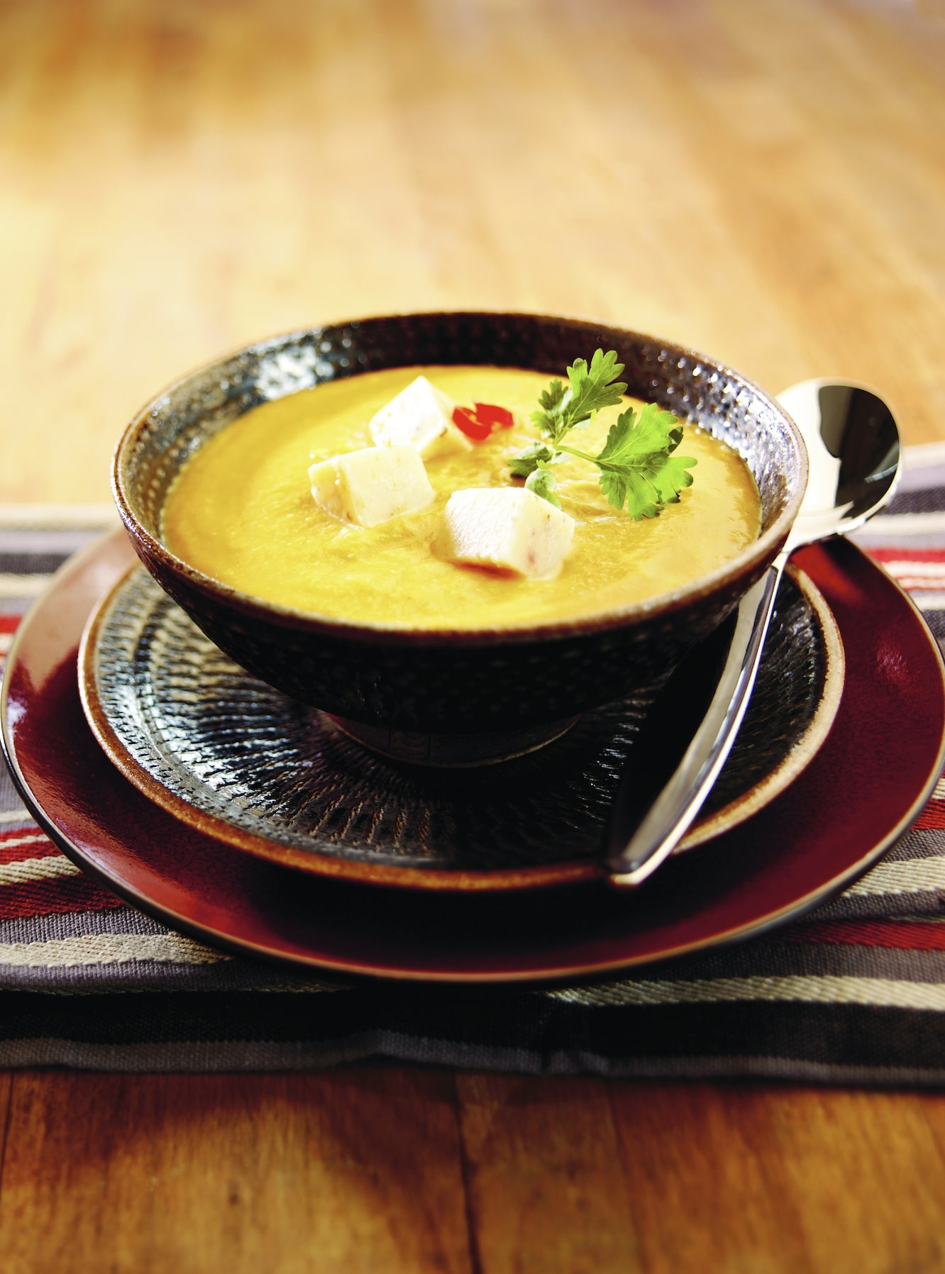 Purée soup in blender until smooth. Adjust seasoning. Serve garnished with the Havarti and cori-ander