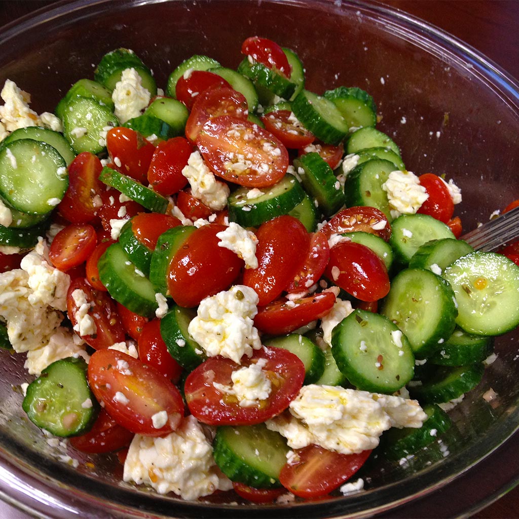 In a large bowl, stir together grape tomatoes, cucumber and feta. Add toasted pita and drizzle with dressing. Toss to combine. Let stand 5 minutes before serving for flavours to develop.