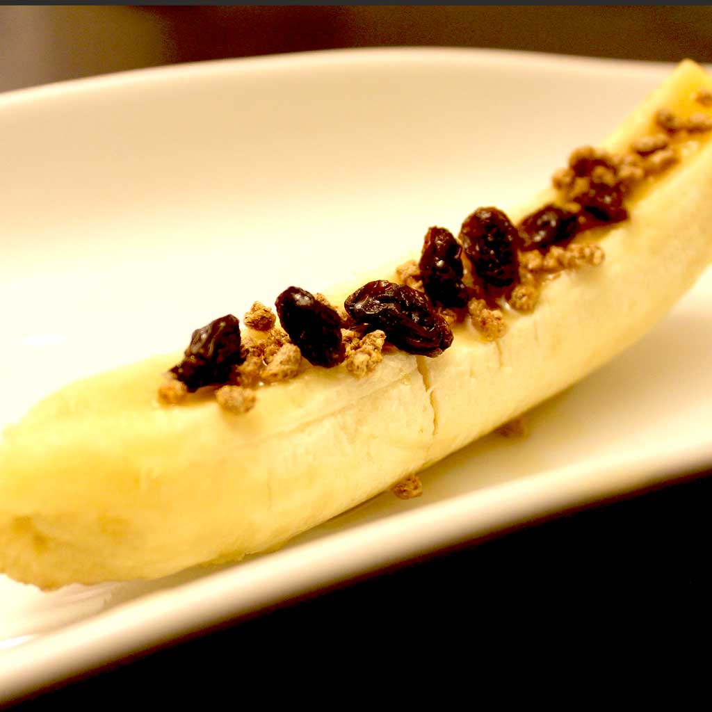 Step 3 Spread into banana boat and sprinkle with raisins if using.