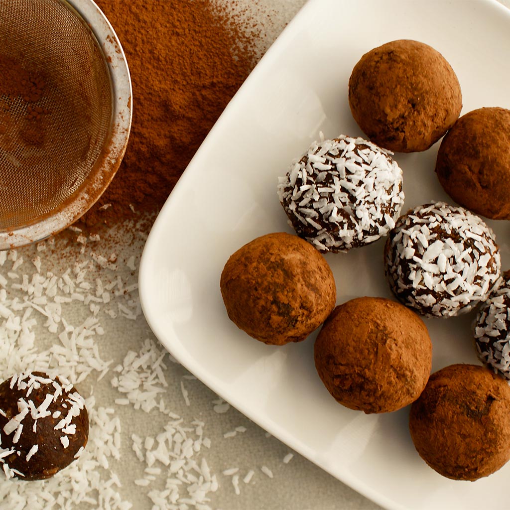 Roll mixture (2 Tbsp/30 mL) into balls about 1 inch (2.5 cm) in diameter, and roll in additional cocoa or coconut to coat. Store in a sealed container in fridge for up to two weeks.