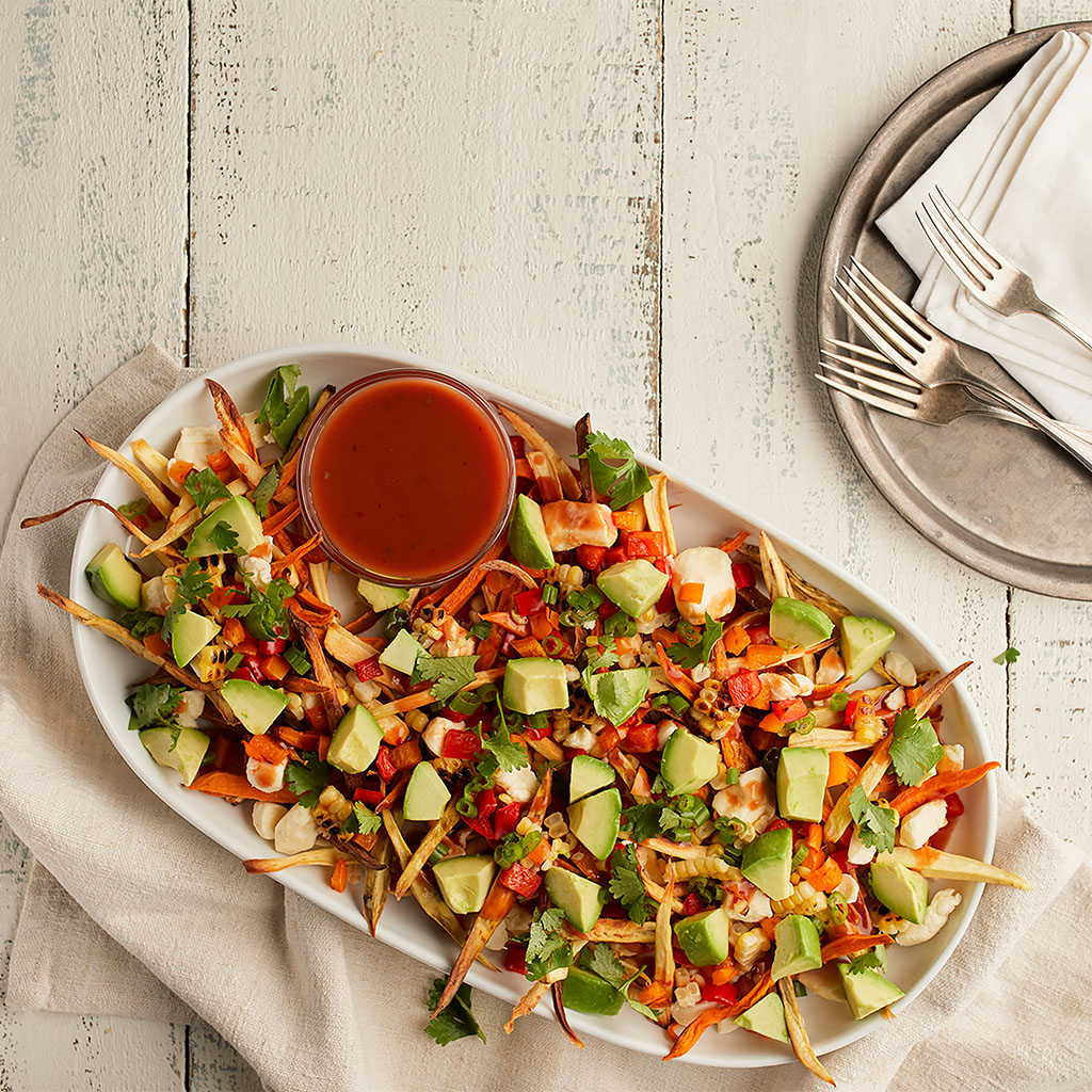 When vegetables are done, put roasted vegetables, cheese curds, roasted peppers, grilled corn, and avocado cubes on a serving platter (or 4 individual plates). Top with shallots and cilantro.